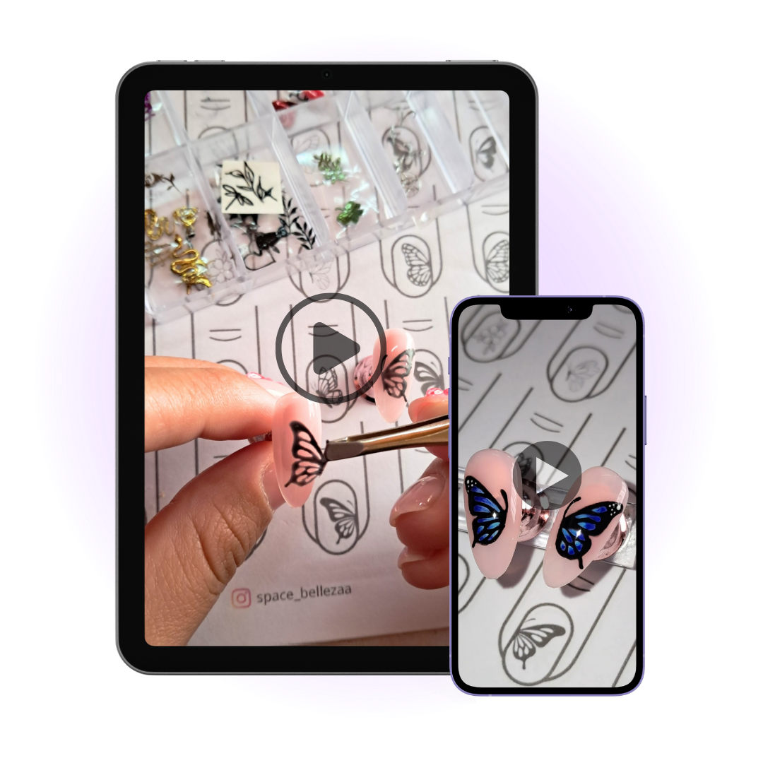 Solo necesitas imprimir tus plantillas, un fólio, esmalte semipermanente/gel painting tus liners, top coat y una cabina, con eso ya puedes crear tus diseños en minutos.